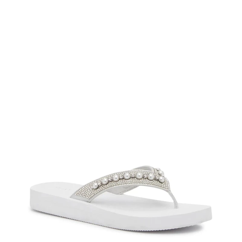 Rhinestone and pearl embellishments on the thong straps add a sparkling style to these women's Kelly & Katie Visciola silver flip flops. Crafted with synthetic upper and lining, these casual sandals have a round open with comfy toe post and an easy slip-on design. The padded footbed provides a comfy while a synthetic sole offers a good grip. This style is exclusive to Designer Brands Canada.
