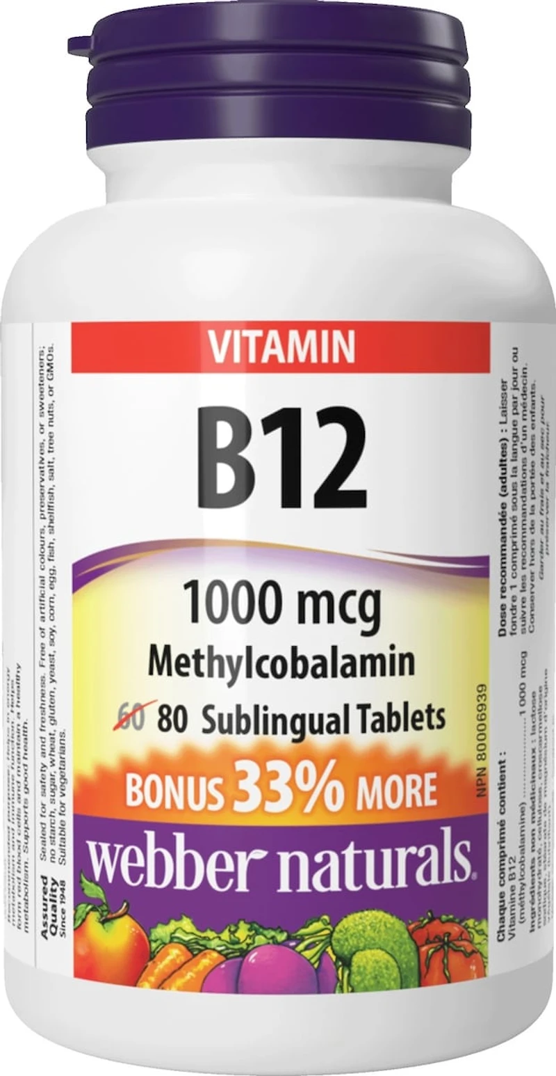 Vitamin B12 Methylcobalamin from Webber Naturals is a one-per-day, high-absorption sublingual tablet providing 1000 mcg of the bioactive form of vitamin B12 to help prevent and correct vitamin B12 deficiency. These quick-dissolve tablets help support energy metabolism, immune function, and red blood cell formation, and are suitable for vegetarians.
