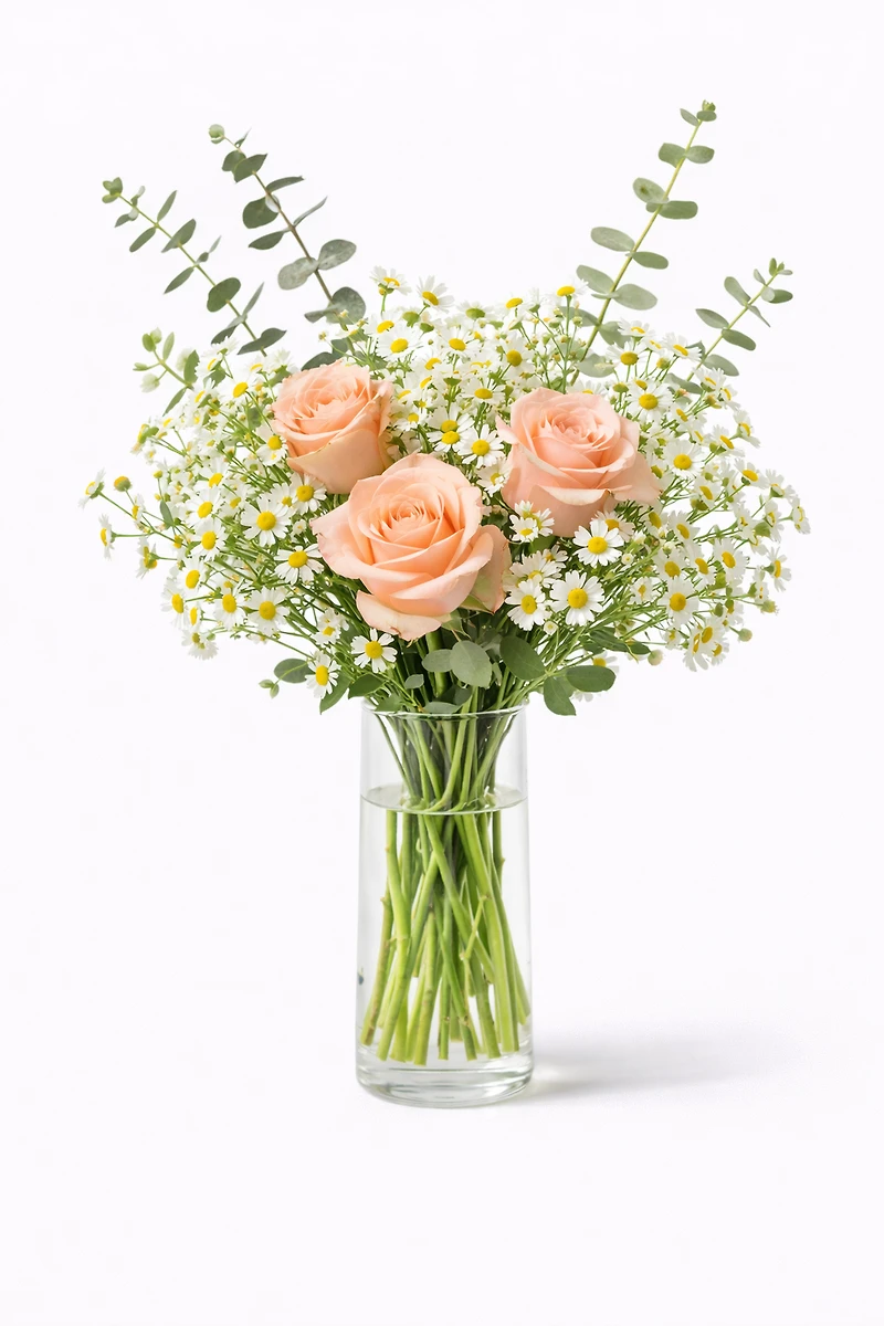 Natural, airy, and effortlessly romantic, Wild & Tender is a bouquet inspired by quiet moments and gentle affection. This arrangement features soft pink roses as the focal point, paired with feverfew blooms for a delicate, wildflower touch. Displayed in a beautiful vase.
