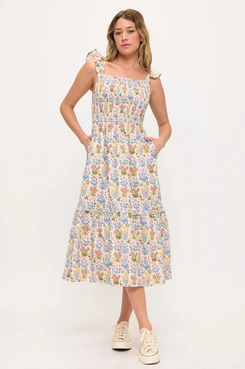 Wildflower Garden Print DressSquare NecklineTeired SkirtRuffled Shoulder Strap100% Cotton