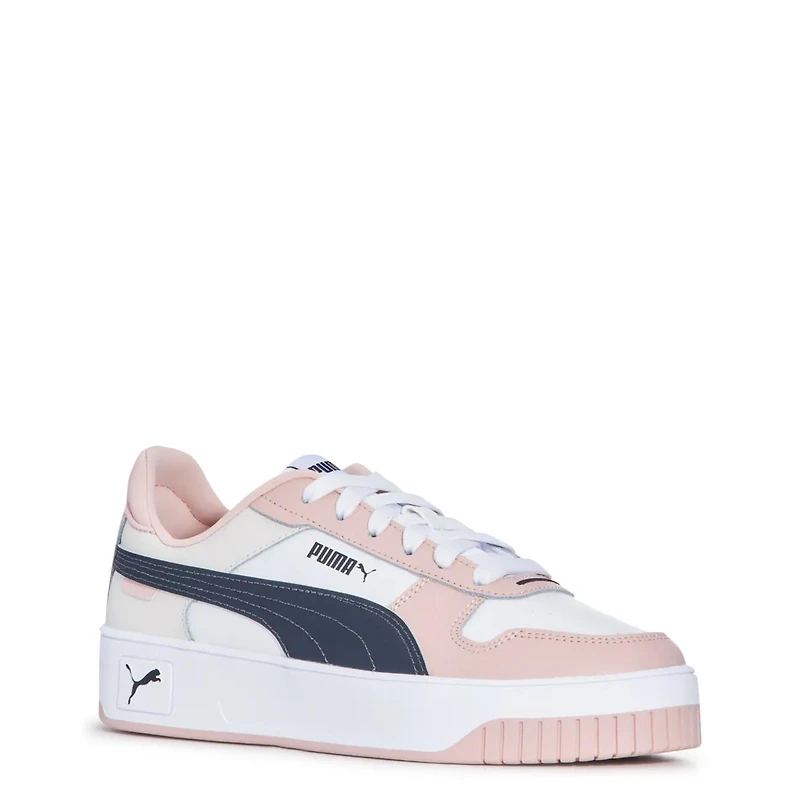 Fashioned in a streetwear-inspired silhouette, these women's Puma Carina Street pink fashion athletic shoes feature a sleek leather and synthetic upper made with at least 20% recycled materials. The lace-up design and iconic PUMA Formstrip add a sporty touch, while the SOFTFOAM+ sockliner and textile lining deliver extra cushioning and comfort. Also, these court sneakers are finished with a rubber midsole and outsole for durability and support.