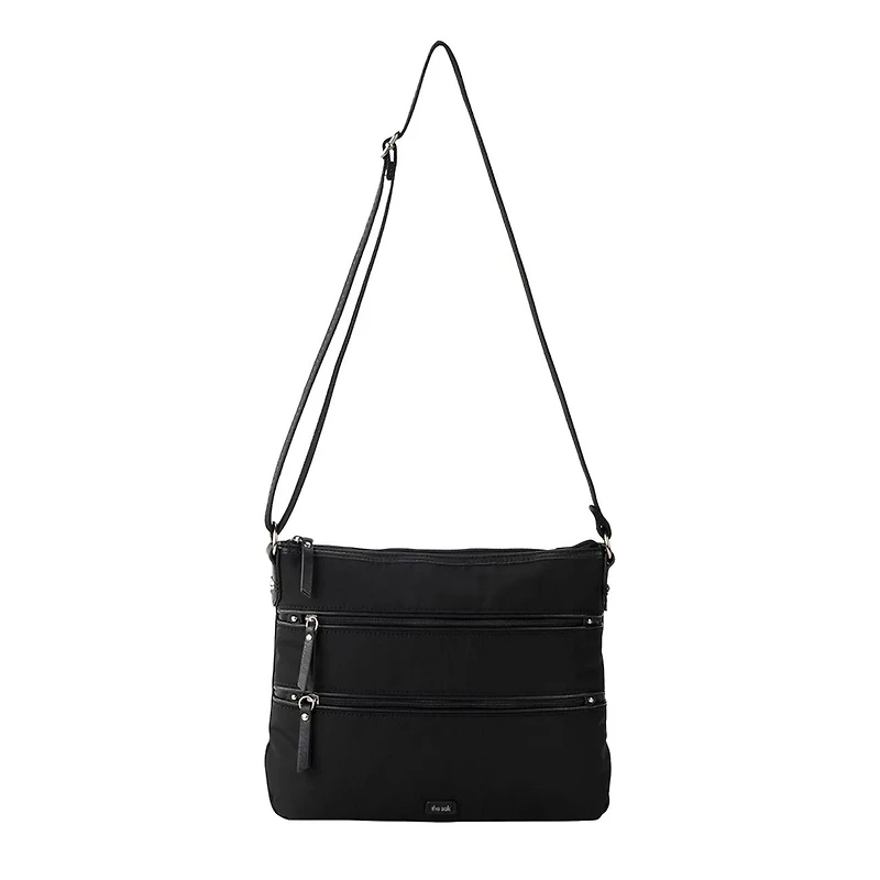 - 100% Repreve Recycled Polyester -EcoTwillMain zipper closureAntique sliver tone hardwareTwo additional front exterior zipper pocketsBack zipper pocketRepreve liningInterior contains a back wall zipper pocket and two front wall multi-functional pocketsUpper front pocket: 9in W x 6.5in D, lower front pocket: 9in W x 3.75in D, back pocket: 7in W x 5.5in DAdjustable crossbody drop length 22"Wipe clean with barely damp cloth and air dryDimension: 11.5" L x 2.5" W x 9.25" H