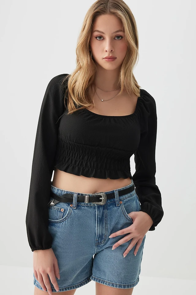 Ardene Smocked Crinkled Long Sleeve Top in Black | Size XS | Polyester/Elastane