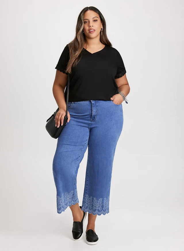 Ruffled T-Shirt & Embroidered Capri Jeans