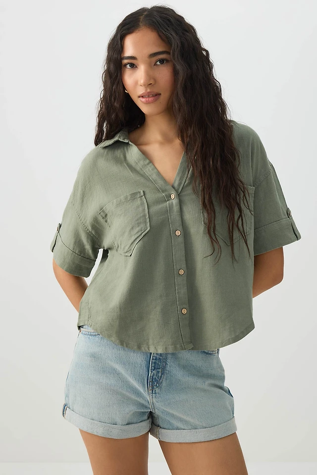 Ardene Linen Blend Utility Shirt in Khaki | Size | Viscose