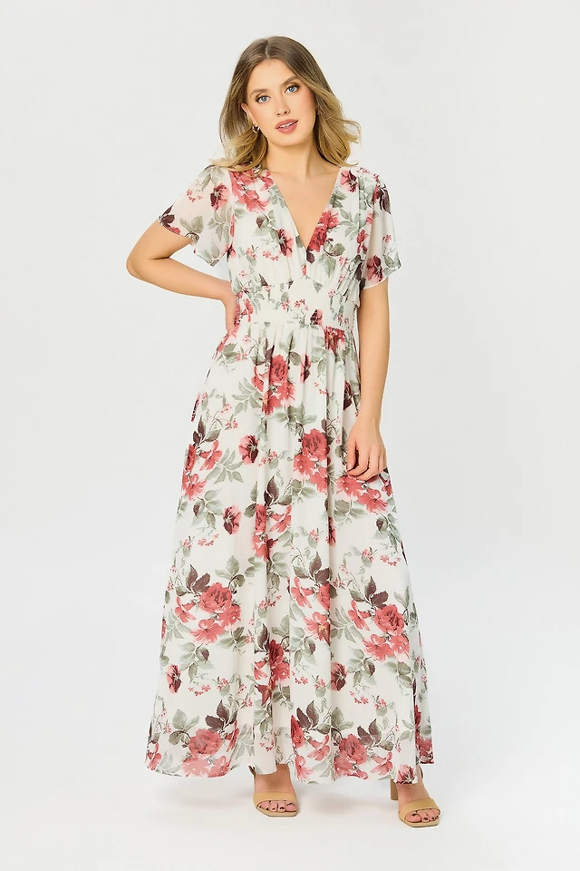 Floral Chiffon Flutter-Sleeve Maxi Dress with Smocked Waist